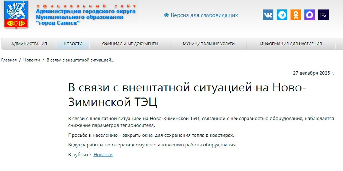 ΠΠΈΡΠ΅Π»ΠΈ Π‘Π°ΡΠ½ΡΠΊΠ° ΠΡΠΊΡΡΡΠΊΠΎΠΉ ΠΎΠ±Π»Π°ΡΡΠΈ ΠΎΡΡΠ°Π»ΠΈΡΡ Π±Π΅Π· ΠΎΡΠΎΠΏΠ»Π΅Π½ΠΈΡ. ΠΠ° ΠΌΠ΅ΡΡΠ½ΠΎΠΉ Π’ΠΠ¦ ΠΏΡΠΎΠ±Π»Π΅ΠΌΡ, ΡΠΎΠΎΠ±ΡΠΈΠ»Π° ΠΌΡΡΠΈΡ 27 Π΄Π΅ΠΊΠ°Π±ΡΡ. Β«Π ΡΠ²ΡΠ·ΠΈ Ρ Π²Π½Π΅ΡΡΠ°ΡΠ½ΠΎΠΉ ΡΠΈΡΡΠ°ΡΠΈΠ΅ΠΉ Π½Π° ΠΠΎΠ²ΠΎ-ΠΠΈΠΌΠΈΠ½ΡΠΊΠΎΠΉ Π’ΠΠ¦, ΡΠ²ΡΠ·Π°Π½Π½ΠΎΠΉ Ρ Π½Π΅ΠΈΡΠΏΡΠ°Π²Π½ΠΎΡΡΡΡ ΠΎΠ±ΠΎΡΡΠ΄ΠΎΠ²Π°Π½ΠΈΡ, Π½Π°Π±Π»ΡΠ΄Π°Π΅ΡΡΡ ΡΠ½ΠΈΠΆΠ΅Π½ΠΈΠ΅ ΠΏΠ°ΡΠ°ΠΌΠ΅ΡΡΠΎΠ² ΡΠ΅ΠΏΠ»ΠΎΠ½ΠΎΡΠΈΡΠ΅Π»Ρ. ΠΡΠΎΡΡΠ±Π° ΠΊ Π½Π°ΡΠ΅Π»Π΅Π½ΠΈΡ - Π·Π°ΠΊΡΡΡΡ ΠΎΠΊΠ½Π°, Π΄Π»Ρ ΡΠΎΡ