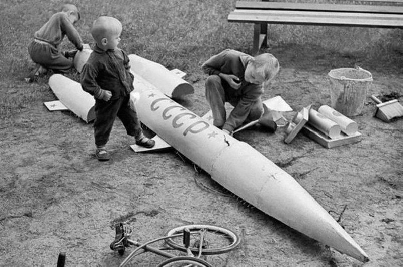 Возможно, мечты советских детей с позиции сегодняшнего дня кому-то покажутся наивными и даже странными. Ведь никто из тогдашней советской детворы не мечтал стать директором банка, важным чиновником, боссом - нефтяником, миллионером или, например, как сейчас, депутатом Госдумы. И не горел желанием получить в качестве подарка на день рождения или Новый год крутой «ноут» или навороченный «айфон», а лучше всего деньги. Советские дети мечтали совершенно о другом: стать героями, поскольку этого требовали выбираемые ими профессии. В те годы, когда наши космические корабли только начали бороздить просторы космоса, многие ребята хотели быть космонавтами или как минимум лётчиками. О чём мечтали дети в СССР очень наглядно показывает нижеприведённый фотоснимок, который датируется 1963 годом. На нём запечатлён момент, когда советские дети во дворе строят из подручных материалом космическую ракету Почему у советских детей были такие мечты? Да потому что вся Советская страна, особенно в 1960-е го