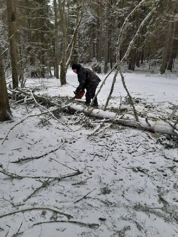 Ночным вчерашним снежным ураганом повалило в лесу дерево и загородило въезд в Слободу 😱😱 но мы ждём гостей и сегодня с утра завал разобран и путь к нам свободен. Ура!!!!👏👏👏👏