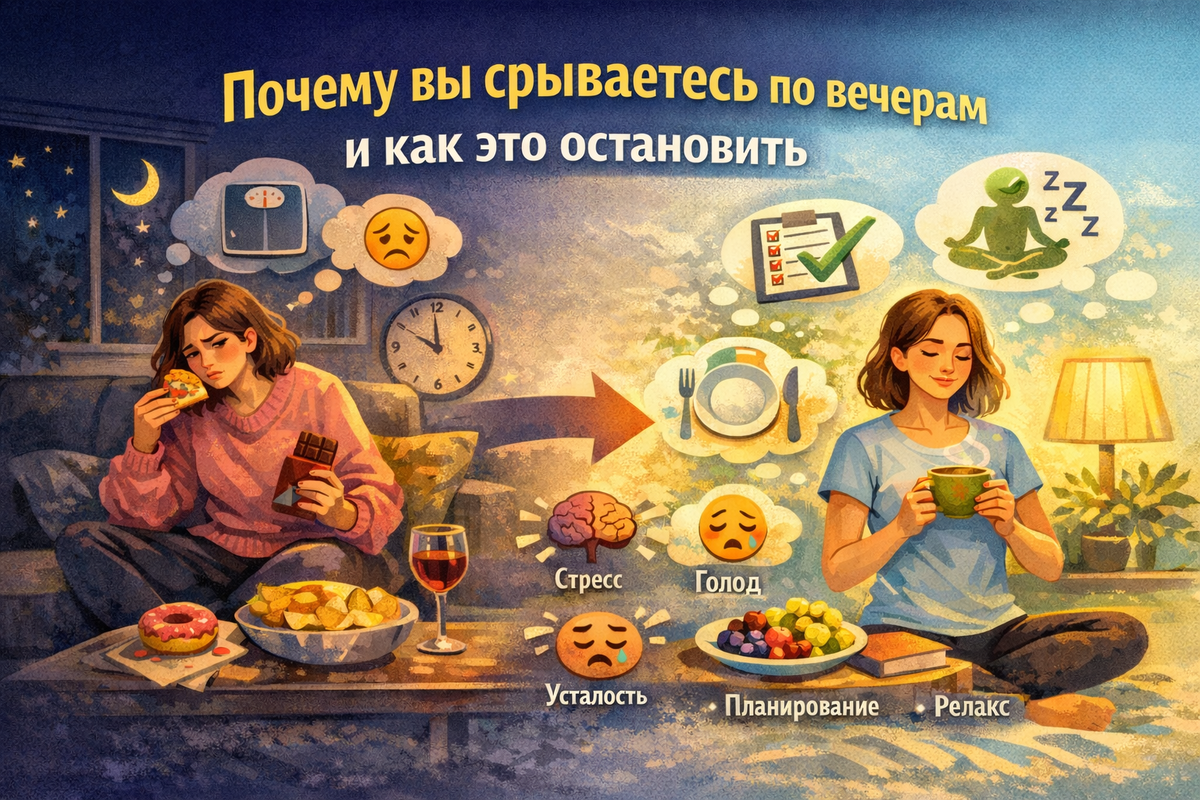 Вечерние срывы — это не приговор. Поняв причины и внедрив простые привычки, вы возьмете контроль. Результат: стабильный вес, энергия, уверенность в себе. Начните сегодня — например, спланируйте завтрашний день с сытным обедом и белковым ужином.
