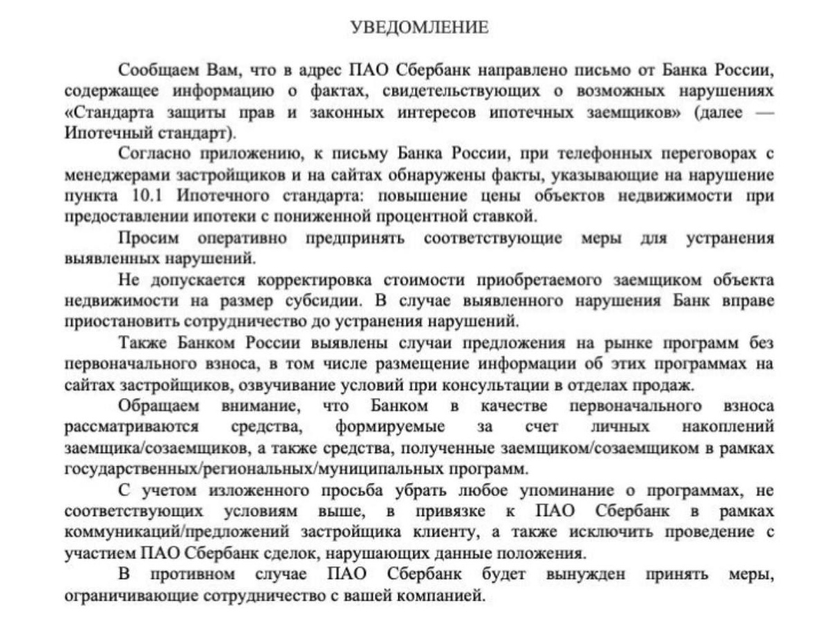 🔶 Ипотечный стандарт в действии: Сбербанк предупредил девелоперов о прекращении сотрудничества если заёмщикам предоставляется пониженная