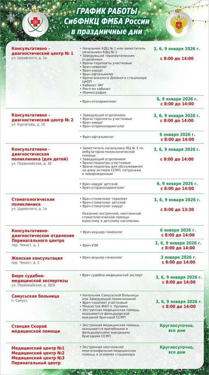 График работы ФГБУ СибФНКЦ ФМБА России в новогодние праздники