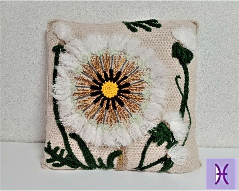 Недавно наткнулась на просторах интернета на фото диванных красивых подушек, но не связанных руками какой-то рукодельницы, а созданных искусственным интеллектом. Красивые подушечки. Решила также попробовать изготовить что-нибудь подобное. Рассказываю поподробней. Вот она на фото - моя подушка. Подушка связана крючком № 2,5. Пряжу использовала Пехорка Новинка Детская серия. Состав 100% акрил высокообъемный. толщина пряжи 200 метров / 50 граммов. Цвет бежевый. Для отделки также использовалась также пряжа, только другой расцветки. Для вязания подушки набирала 64 воздушные петли. И вязала столбиками без накида, поворотными рядами. Всего 66 рядов. Когда квадраты были связаны, на одном из них вышила одуванчик. Чтобы соединить обе части наволочки, я их по контуру обвязала крючком, одним рядом столбиков без накидов. Обвязывать начинала не с угла, а примерно 5 см до него, чтобы уголки были одинаково закругленные. После обвязки последнего 4-го уголка, также провязала 5 см. Нитку не обрезала. В