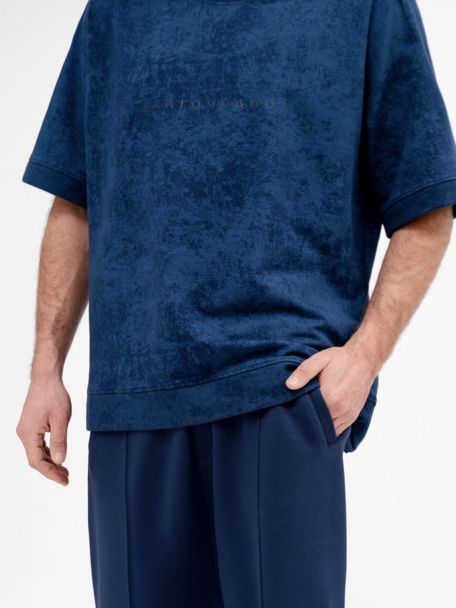 Она создана, чтобы ощущаться правильно. Один из наших материалов — длинноволокнистый хлопок высшей категории с эффектом «Персика». Его волокна длиннее и чище обычного хлопка, поэтому ткань гладкая, плотная и естественно дышащая. Прикосновение к ней — как дыхание ветра у Байкала: прохладное, мягкое, глубокое. Такую ткань мы используем в серии “Байкал”. Не случайно. Дизайн серии «Байкал» вдохновлён магией ледового царства — тем, как свет играет в трещинах, похожих на звёздные тропы. Байкал — символ чистоты и глубины, и в том числе этим вдохновлена текстура. Потому что одежда — это не просто про образ, это про прикосновение.