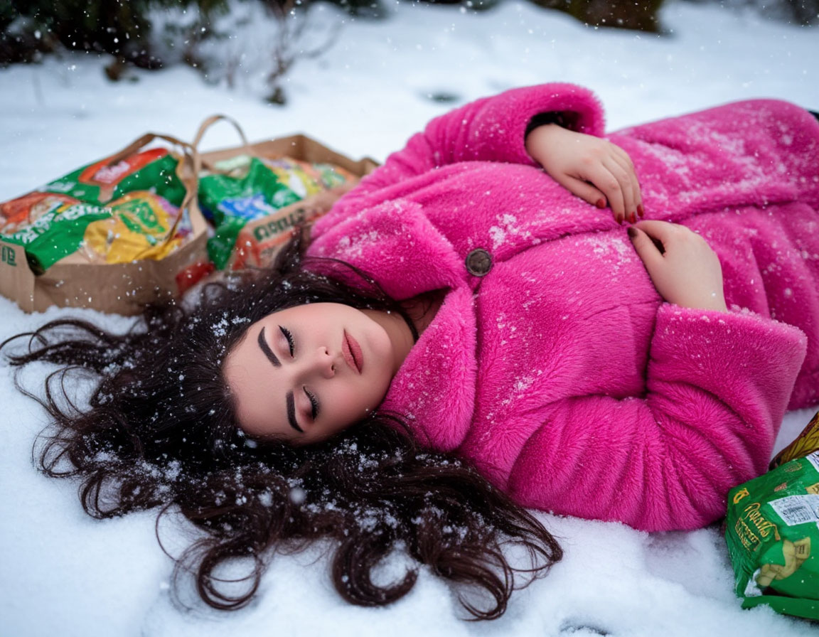 Её тело, мягкое, податливое, глухо шлёпнулось в глубокий, нетронутый сугроб, намело дворниками к краю дорожки. Снег, холодный и невесомый, тут же начал засыпать её розовое пальто, капюшон, рассыпавшиеся по снегу тёмные волосы. Одну сумку совсем занесло, из другой виднелся угол коробки с трюфелями. Розовый шарф, её любимый, шёлковый, подарок от Дмитрия в прошлом году, выскользнул из-под пальто и трепетал на ветру, как последний лепесток увядшего цветка. Потом и его начало заметать.