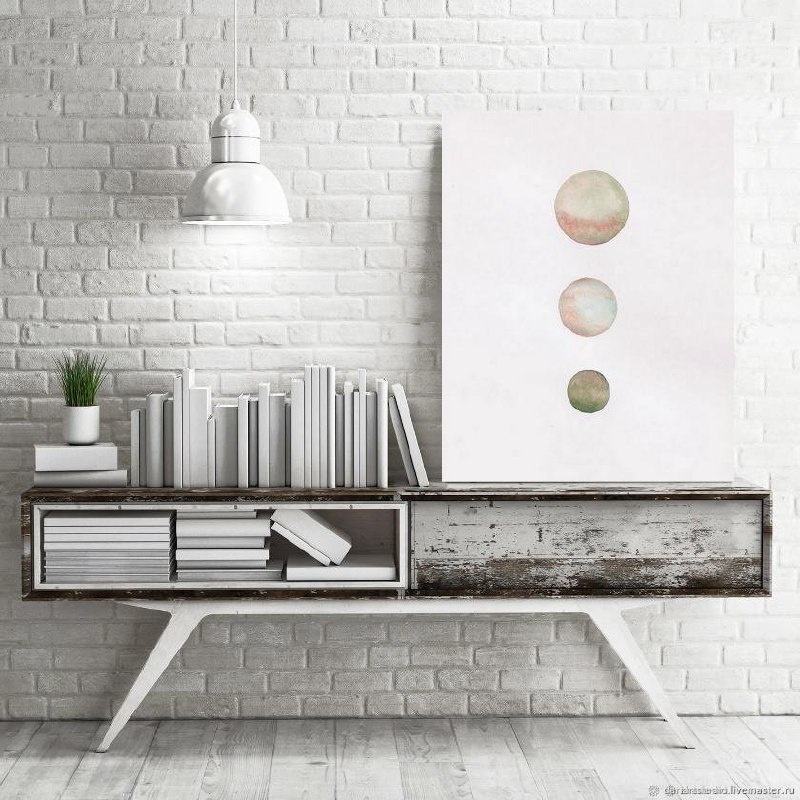 Картины для спальни: Минималистичная абстракция для светлого интерьера Нежная минималистичная абстрактная картина с тройкой мягких пастельных кругов идеально дополняет светлый сканди-интерьер спальни. Картина добавляет лёгкость и визуальный баланс, подчёркивая белую кирпичную стену и лаконичную мебель спальни. Идеальна для тех, кто любит спокойный, чистый, стильный декор без визуального шума. Больше примеров подбора картин к интерьеру: https://lcvr.net/IlSP