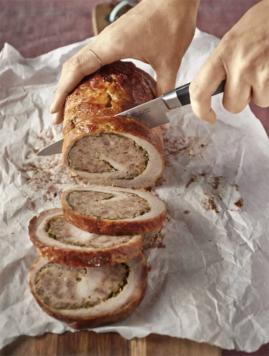 Не хотите подавать колбасу или не доверяете магазинным мясным нарезкам? Попробуйте вот такой вариант домашнего мясного рулета к празднику. Большой кусок свинины без кости, жира и кожи разрезать таким образом, чтобы у вас получилось плоское полотно мяса. Накройте пищевой пленкой и слегка отбейте для ровности и пластичности. Вам понадобится кусок примерно 700-900 гр. Смешайте 400 гр. свиного фарша с яйцом, приправьте солью и перцем. Добавьте сухие пряные травы, пару столовых ложек майонеза и столько же тертого сыра. Вымесите смесь и намажьте на отбитую свинину. Сверните свиную все в рулет. Затем перевяжите его бечевкой, смажьте майонезом, посыпьте приправами и солью. Заверните в алюминиевую фольгу. Поместите в противень или жаропрочную форму и поставьте в духовку, предварительно разогретую до 200°C. Выпекайте 20 минут, затем уменьшите температуру до 120°C и выпекайте еще 70 минут. Подавайте полностью охлажденным, лучше на следующий день после приготовления. Приятного!