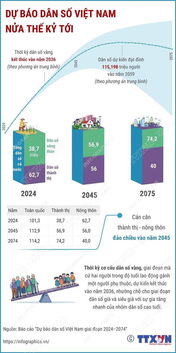 По мнению большинства экспертов, население Вьетнама вырастет до пика в 115.198 миллиона человек к 2059 году, после чего начнёт сокращаться