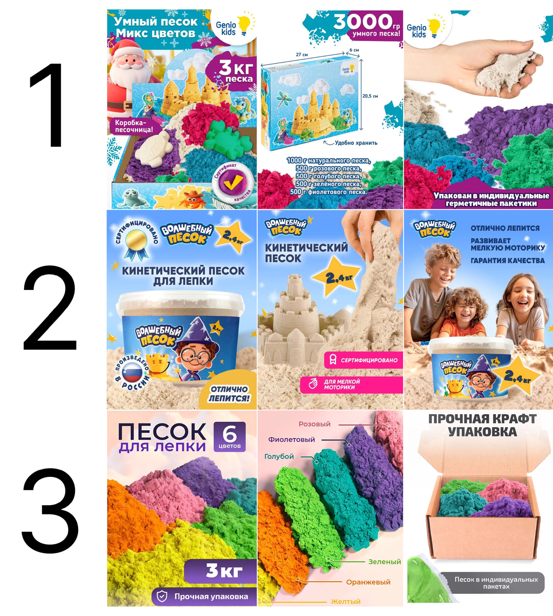 Просили разобрать - так и сделаю. Разбираем на Озоне, как обычно - потому что там видно продажи. На ВБ карточек все же побольше, но основные всё те же. Никак не могу сказать, что в нише высокая конкуренция. Не так много брендов. Но конкурируют эти товары, конечно, не только друг с другом, но и со всем, что подойдет детям для и игры и развития. У моих детей такого песка не было, хотя, конечно, я о нем знаю. По-моему классная вещь, и лепить из него проще чем из того же пластилина. Здесь редкий случай, когда ЦА достаточно однородна - мамы маленьких детей, возможно, бабушки. Думаю, что в ЦА есть мамы разного уровня знания, что это за песок. Взяла 3 карточки одного ценового диапазона - 700-800 рублей. В этот раз получилось подобрать карточки так, что у них сопоставимое количество показов. И мы как раз сможем посмотреть, какая из них лучше этими показами распорядилась. У одной из карточек низкий CTR, у другой - низкая конверсия в корзину. А у лидера - всё ровно. Доп.слайды - в комментариях.
