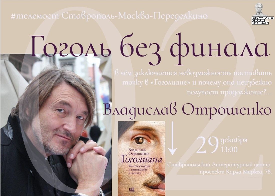В литературном центре пройдет телемост Ставрополь-Москва-Переделкино с писателем и исследователем Владиславом Отрошенко. Участники обсудят новую книгу автора «Гоголиана. Фантасмагория в тринадцати новеллах». Владислав Отрошенко – российский писатель и эссеист, член жюри премии «Ясная Поляна». Его произведения вошли в национальную антологию «Современная литература народов России». Книга Отрошенко «Гоголиана и другие истории» заняла первое место и получила золотую медаль на Пятом Берлинском международном конкурсе «Лучшая книга года 2014». В России этот сборник «эссе-новелл» стал бестселлером и вошел в топ-20 рейтинга продаж Дома Книги «Москва». 🔹Где: пр. Карла Маркса, 78. 🔹Когда: 29 декабря в 13:00. Запись на мероприятие по тел. +7(8652)26-31-50. #анонссобытий | дайджест