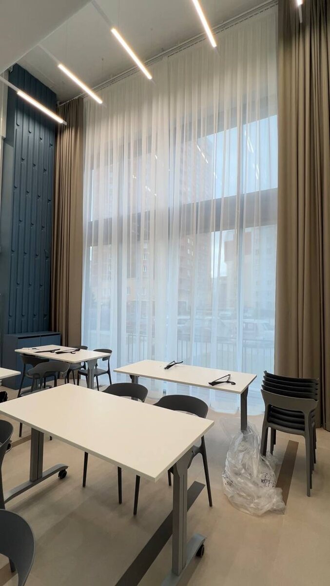 Легкий, но только на первый взгляд☝️ Важно посмотреть не только на результат, но и на технические моменты реализации: Во-первых, в каждом кабинете и в переговорке (на высоте 5 метров) установлены наши любимые карнизы на 0,5 профиле. Создали приватность легким тюлем, но функционал с открытием/закрытием постарались сделать максимально комфортным, без дополнительных усилий. Во-вторых, комната для обучения с двумя лифт-системами и электрокарнизами. Потолки там достигают высоты в 7 метров. Чтобы во время учебы сотрудников ничего не отвлекало от процесса — одним нажатием кнопки можно закрыть панорамные окна текстилем: со стороны офиса — это тюль, а со стороны улицы добавили ещё и портьеры. Проект дизайн-студии DizArt