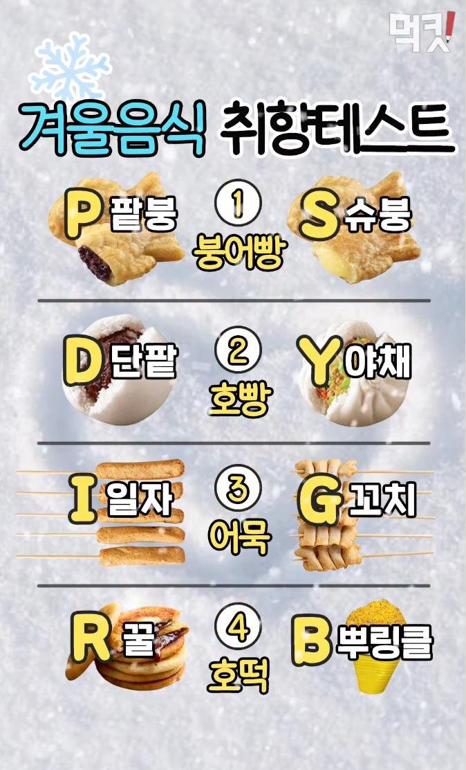 В корейских соцсетях сейчас массово залетают зимние тесты на вкус — 겨울음식 취향 테스트 (дословно: «тест на зимние вкусовые предпочтения»). Формат простой: выбираешь вариант → получаешь «тип личности» → идёшь читать комментарии и спорить 😄 Разбираем, что тут написано ⬇️ 1. 붕어빵 — бунгеоппан (рыбка с начинкой) P 팥붕 — с красной фасолью S 슈붕 — с заварным кремом 2. 호빵 — хобан (пышная паровая булочка) D 단팥 — сладкая, с фасолью Y 야채 — с овощной начинкой 3. 어묵 — омук (рыбные палочки в бульоне) I 일자 — прямые G 꼬치 — на шпажке 4. 호떡 — хотток (корейский сладкий блин) R 꿀 — с мёдом и орехами B 뿌링클 — «ппурингкл» (сырно-сладкая приправа, ультракорейский вариант) По выбранным буквам в корейских рилсах потом собирают тип характера — почти как MBTI, только зимний и съедобный. ❓ А теперь главное Напишите в комментариях, кто вы: например 👉 S-Y-G-R или P-D-I-B