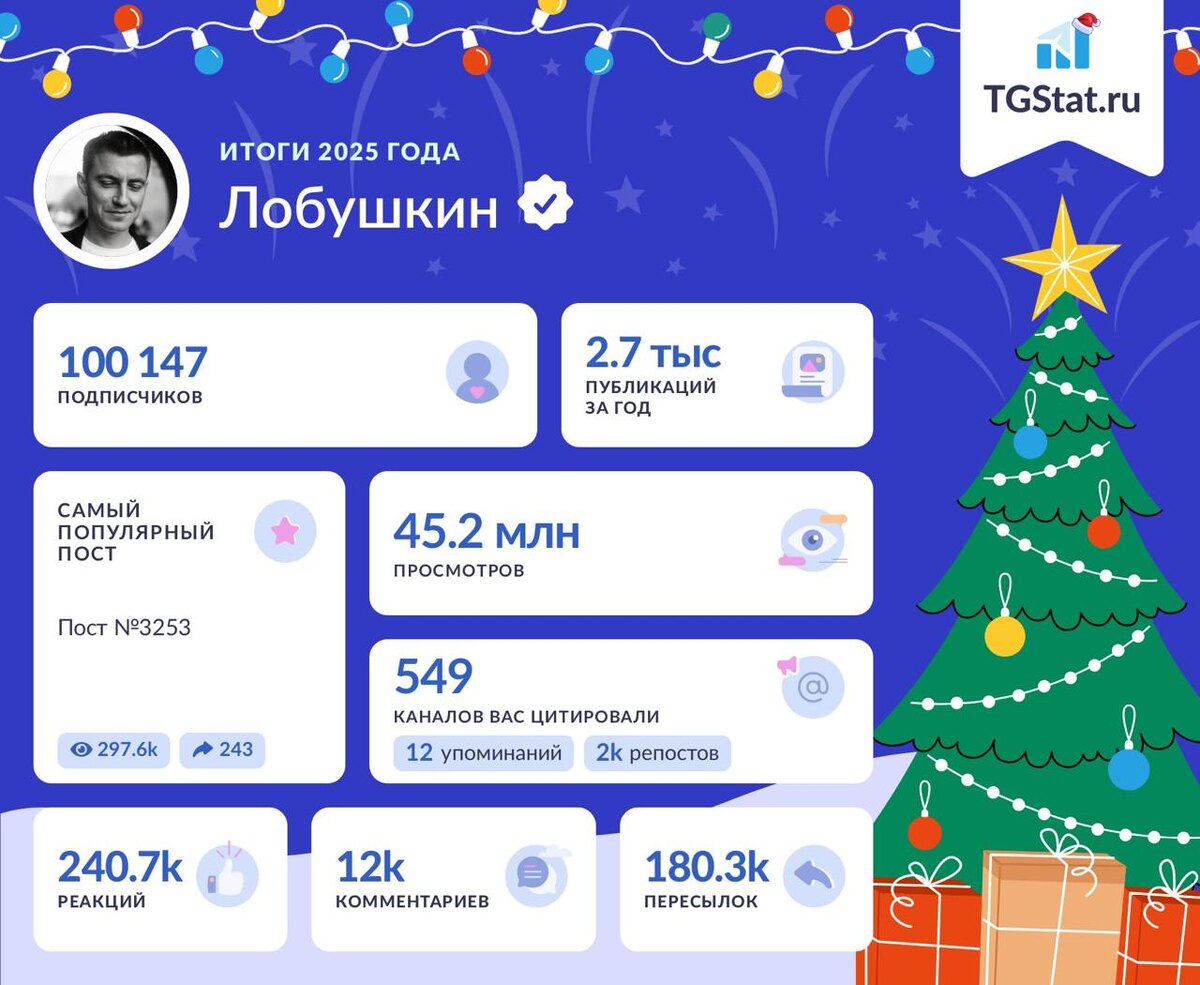 TgStat выкатил статистику. Спасибо, что читаете редакцию канала «Лобушкин», в новом году будем делать ещё интереснее.