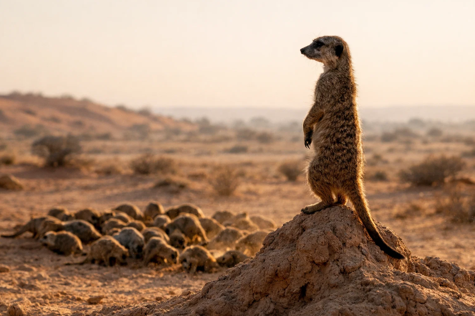 В безжалостных просторах пустынь Южной Африки, где раскалённый песок днём обжигает всё живое, а ночью температура падает до нуля, выживание кажется чудом. Однако здесь, в этом суровом мире, процветает одно из самых удивительных и социально развитых существ — сурикат. Эти небольшие мангусты, известные своей характерной позой «столбиком» и живым любопытством, превратили коллективную безопасность в высокое искусство. Их система караулов, сложная и отлаженная, является краеугольным камнем выживания вида и предметом пристального изучения биологов.