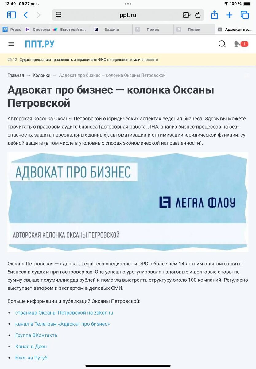 Одно из достижений этого года, у меня появилась своя авторская колонка на портале ППТ (помогаем преодолевать трудности). Там будут также размещаться мои статьи на интересные (надеюсь) и полезные (точно) статьи. Если вы читаете это издание, то теперь знаете в чью колонку нужно заглянуть, а если нет, то предлагаю попробовать (много экспертных материалов в сфере права, налогов и бухгалтерского учета). Меня читать можно будет здесь Но пока счетчик статей равен нулю 🥲 прошу понять и простить, но немного сумасшедший декабрь не дает возможности выдохнуть. Обязательно похвастаюсь, когда мои экспертные материалы начнут выходить. #обомне #сми #нашипобеды