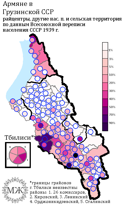 Если брать доли по районам и отдельным населённым пунктам, по которым у нас имеется информация, самая высокая доля армян была в Шаумяни Борчалинского района, где они составляли 94,5% населения. Далее идёт Ахалкалаки и сам Ахалкалакский район, доля в которых была 87,5% и 83,3% соответственно.