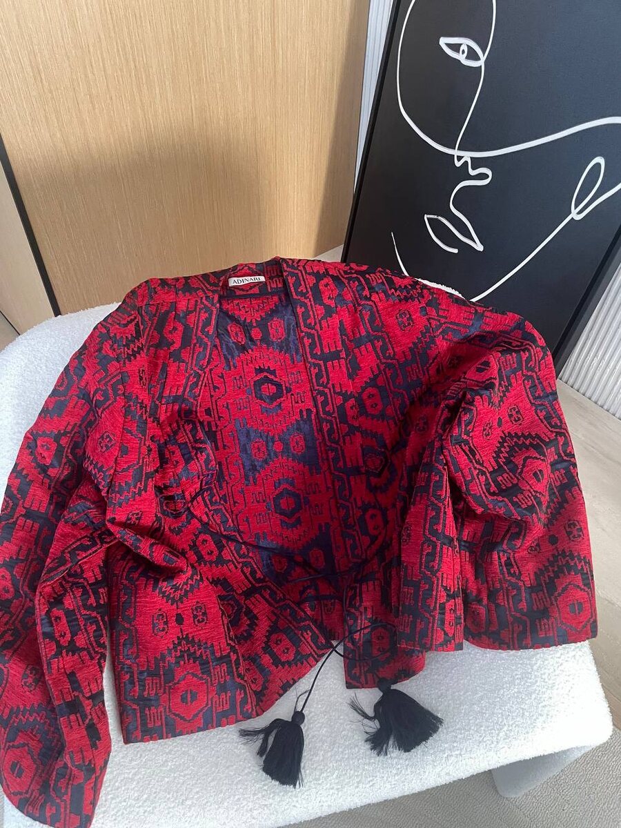 Год прошел под знаком Востока в фэшн. Шаровары я проигнорила, а вот жаккардовым жакетом обзавелась. По крою напоминает чапан, только с кисточками. А по узорам сразу все восточные ковры. Это российский бренд Adinari. Не усложняю, ношу с серыми джинсами и черными брюками.