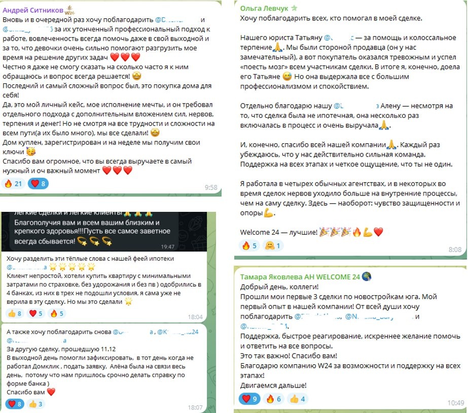 🫂. В Welcome 24 у нас есть особое пространство в командном чате – тема «Благодарности». Там коллеги делятся тёплыми словами друг о друге, клиентам и всей команде. Периодически захожу туда полистать сообщения – и каждый раз ловлю одну и ту же мысль: именно ради этого и строим компанию. Ради людей, которые поддерживают друг друга, вытаскивают сложные сделки, остаются на связи в выходные и по‑настоящему переживают за результат. Сегодня хочу поделиться несколькими такими отзывами из нашей внутренней «копилки благодарностей». Для меня это сильное напоминание, зачем существует Welcome 24 и какую атмосферу мы создаём внутри. Если тебе откликается такая культура – добро пожаловать в наше комьюнити риелторов нового поколения.