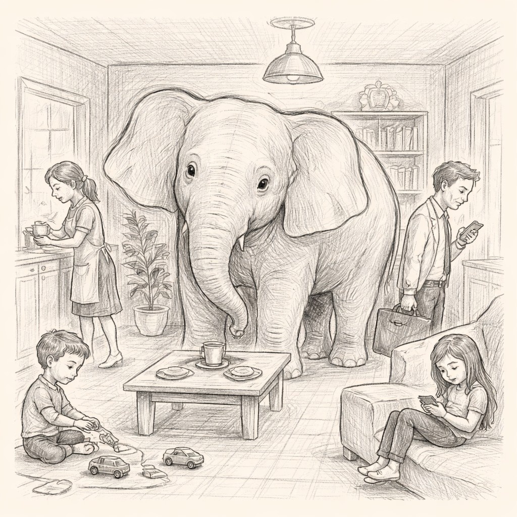 Кухня, стол, чашки, разговоры о школе, работе, планах на выходные. И ещё — в комнате стоит огромный слон. Он занимает почти всё пространство.