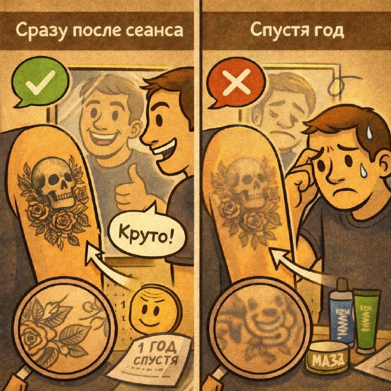 🤔 В день сеанса всё может выглядеть идеально. Кожа свежая, линии чёткие, клиент доволен и улыбается в зеркало. Но татуировка — это не момент, а процесс во времени. И есть ошибки, которые не кричат сразу, а тихо ждут, пока заживление и годы сделают своё дело. Самая частая ошибка — работа «на эффект сегодня». Слишком тонкие линии там, где кожа подвижная. Мелкие детали без запаса на расплытие. Градиенты, которые выглядят мягко на свежей коже, но через год превращаются в серую кашу. В день сеанса это выглядит красиво. Через время — читаемость уходит первой. Вторая ошибка — неправильная глубина. Чуть недобил — и пигмент начнёт сходить пятнами, появятся проплешины. Чуть переборщил — и через год линия станет толще, темнее и грязнее, чем задумывалось. На свежей тату это не всегда видно, потому что покраснение и отёк маскируют проблему. Третья — игнорирование движения тела. Пока клиент стоит ровно, тату «сидит». Через год, когда кожа живёт своей жизнью, рисунок начинает плыть: смещается це
