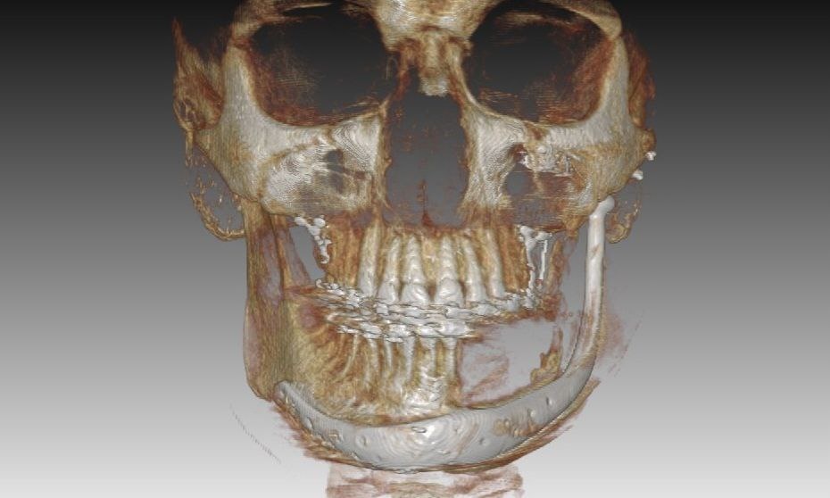 У этого пациента титановый эндопротез и невозможно протезировать. Нет возможности устанавливать имплантаты — только поддерживающие съемные протезы. Пациент перенёс более 10!!! операций на нижней челюсти. Диагноз: артериовенозная мальформация. Многочисленные операции на нижней челюсти (больше 10), так как постоянно ломались или отторгались все установленные конструкции. Была замещающая титановая пластина, был костный лоскут (аутотрансплантат), на данный момент индивидуальный титановый эндопротез с суставом. За этот период полностью менялся прикус (в связи с операциями), асимметрия жевательных мышц и в связи с этим постоянно менялась нагрузка на оставшийся сустав. На данный момент проходит ортодонтическое лечение как подготовка к съемному протезированию.