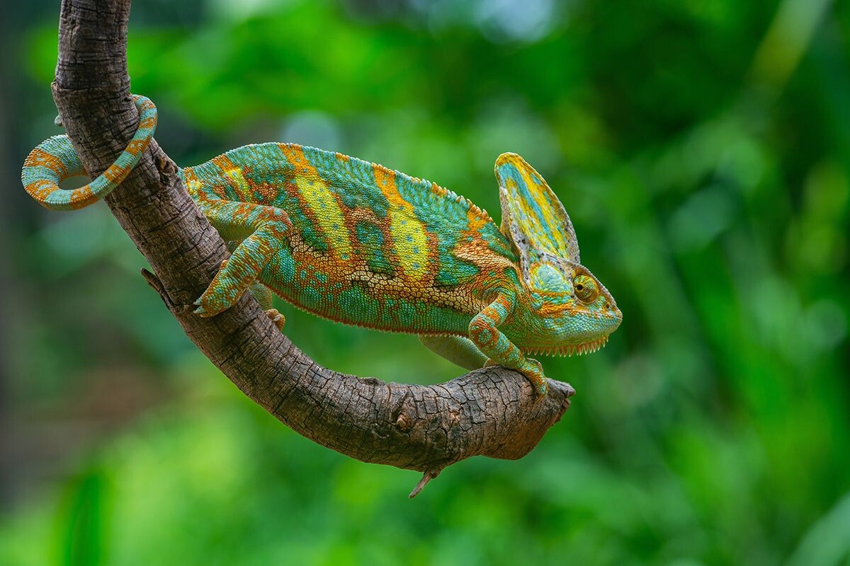 Умение хамелеона менять окраску — одно из самых удивительных явлений в животном мире. Долгое время считалось, что этот механизм работает только для маскировки, но современные исследования раскрыли гораздо более сложную и осмысленную систему. Настоящие причины смены цвета Хамелеон меняет цвет прежде всего для коммуникации: • Выражение эмоций (страх, агрессия, ухаживание) • Регулировка температуры тела • Реакция на освещение и влажность Физика цвета: не пигменты, а нанокристаллы Секрет кроется в особых клетках — иридофорах, содержащих микроскопические кристаллы гуанина. Эти кристаллы образуют упорядоченную решетку, которая преломляет свет. Когда хамелеон напрягает или расслабляет кожу, расстояние между кристаллами меняется, что приводит к изменению длины волны отраженного света. Трехуровневая система клеток Цвет создается комбинацией трех типов клеток: • Ксантофоры (желтый/красный пигменты) • Иридофоры (синий/белый структурный цвет) • Меланофоры (коричневый/черный пигменты) Управля
