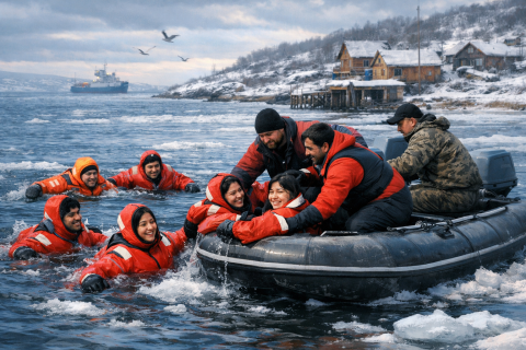 Инцидент произошёл в прибрежной зоне Мурманска. Пятеро туристов — три гражданки Китая и два гражданина Индии — находились в воде в специальных костюмах для айс-флоатинга в районе прибрежного рынка, когда их начало уносить в Кольский залив.