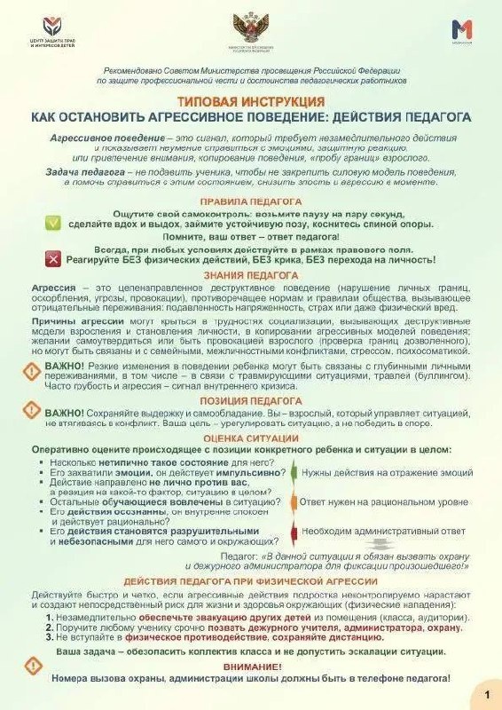 детьми. Некоторые примеры из методички: — Ощутите свой самоконтроль: возьмите паузу на пару секунд, сделайте вдох и выдох, займите устойчивую позу, коснитесь спиной опоры. Помните, ваш ответ — ответ педагога; — Резкие изменения в поведении ребенка могут быть связаны с глубинными личными переживаниями, в том числе — с травмирующими ситуациями, травлей; — Педагог должен вербализовать эмоции и перефразировать слова нападающего, не говоря с позиции обвинения или отторжения. Учитель должен исключить из своей речи агрессию и негатив; — Если школьник атакует учителя, нужно эвакуировать других учеников, поручить позвать охрану или дежурного и сохранять дистанцию с агрессором.
