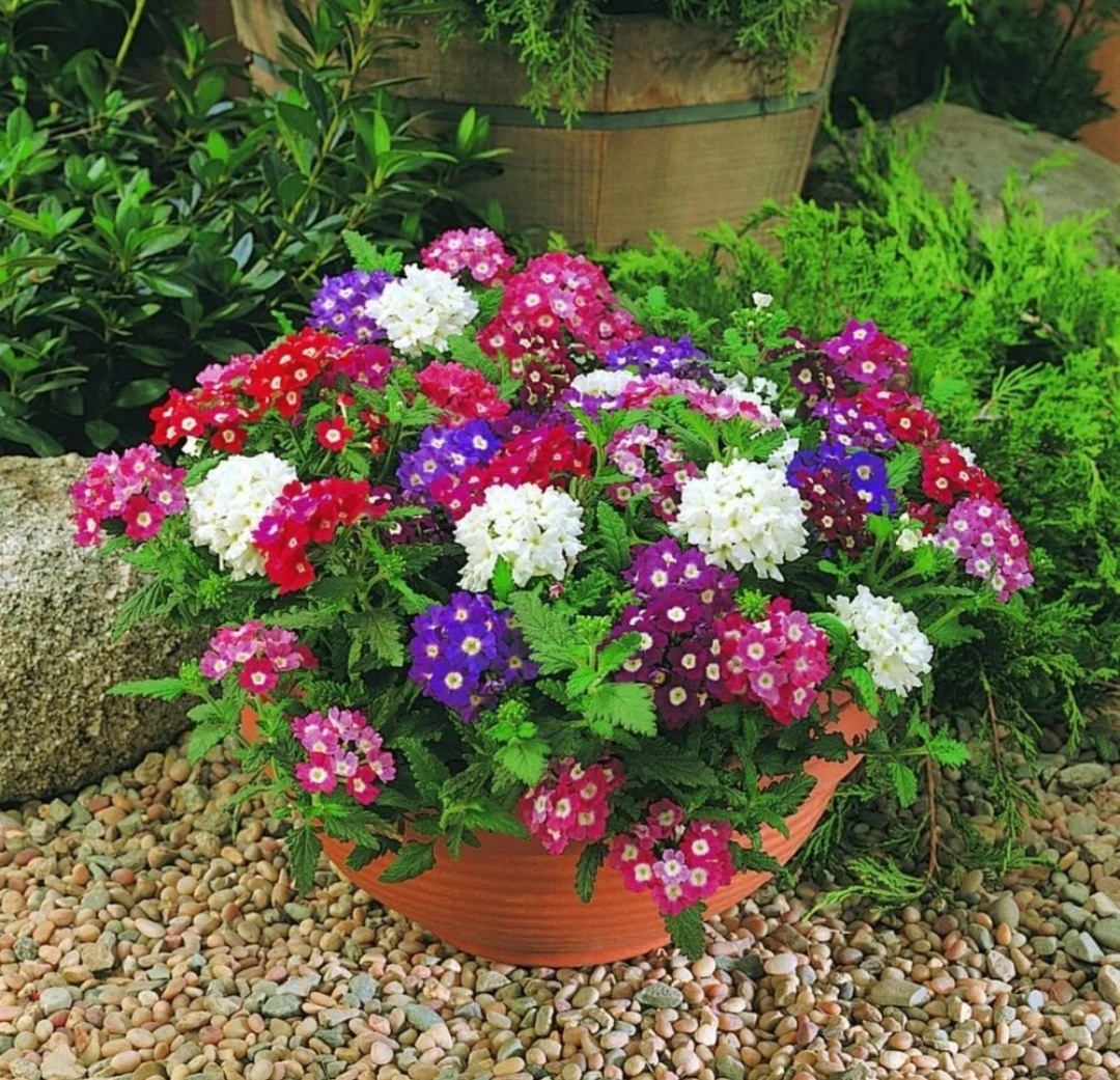 Вербена гибридная – эффектный однолетник высотой до 20-30 см – восхищает богатством палитры. Ее цветы могут быть белыми, красными, синими, фиолетовыми, бордовыми, есть также сорта с привлекательной пастельной и двухцветной окраской. Цветение начинается в июле и длится вплоть до октября, даря яркие краски до самых холодов.