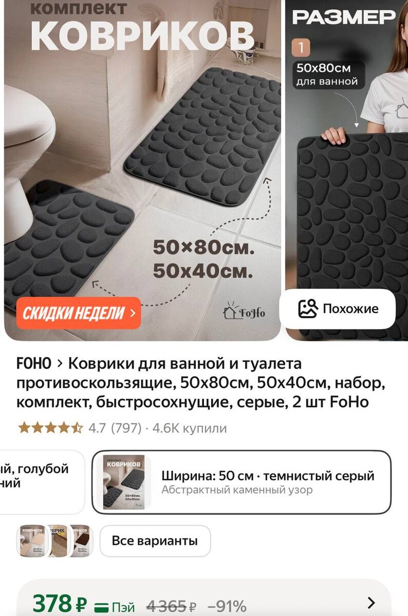 Коврики для ванной и туалета противоскользящие, 50x80см, 50x40см, набор, комплект, быстросохнущие, серые, 2 шт FoHo
