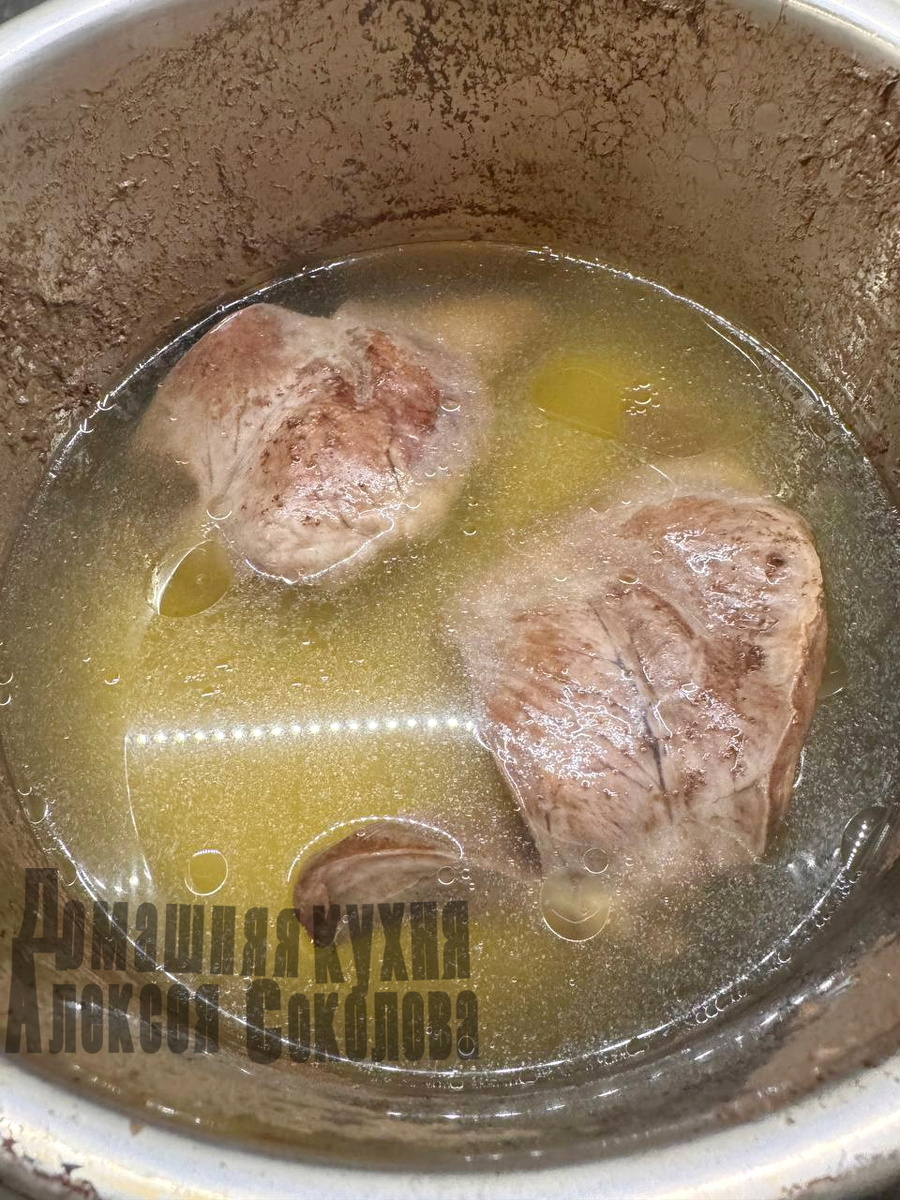 Доброго вам дня, дорогие любители холодных закусок! 😊 Я обожаю все такие штуки – фруктовые желе, заливные, холодцы, концентрированные застывшие бульоны и все, что рядом. Этот вариант хорош тремя отличительными особенностями: 1. Он недорогой (я использовал свиное сердце, точно так же можно приготовить любое другое) 2. Рецепт – простой 3. Блюдо получается очень вкусным И сразу оговорка – это заливное я делаю в скороварке под максимальном давлением. В кастрюле тоже можно, но сколько времени это займет, я не знаю. · Сердце · Любые корнеплоды и обрезки овощей, зелень · Душистый и черный перцы, лавровый лист · Вода · Агар-агар, соль Сердце хорошо промыть от остатков крови. Можно замочить на пару часов и промыть. Убрать в чашу скороварки, залить водой, чтобы покрывала сердце и отварить под максимальным давлением 15 минут. Сердце промыть еще раз, бульон слить, чашу очистить. Вернуть сердце в чашу, добавить все специи и овощи. В моем случае – это обрезки лука, моркови, болгарского перца, сельд
