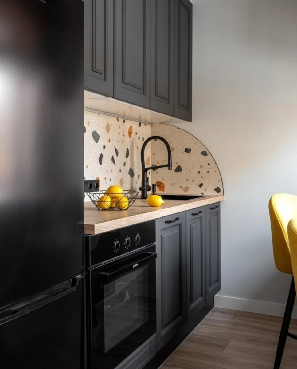 Главная звезда квартиры — кухня. Вместо обычных светлых фасадов здесь использован насыщенный тёмно-грифельный оттенок. Он смотрится солидно и визуально «собирает» небольшое пространство, а дерево столешницы добавляет тепла и домашности.