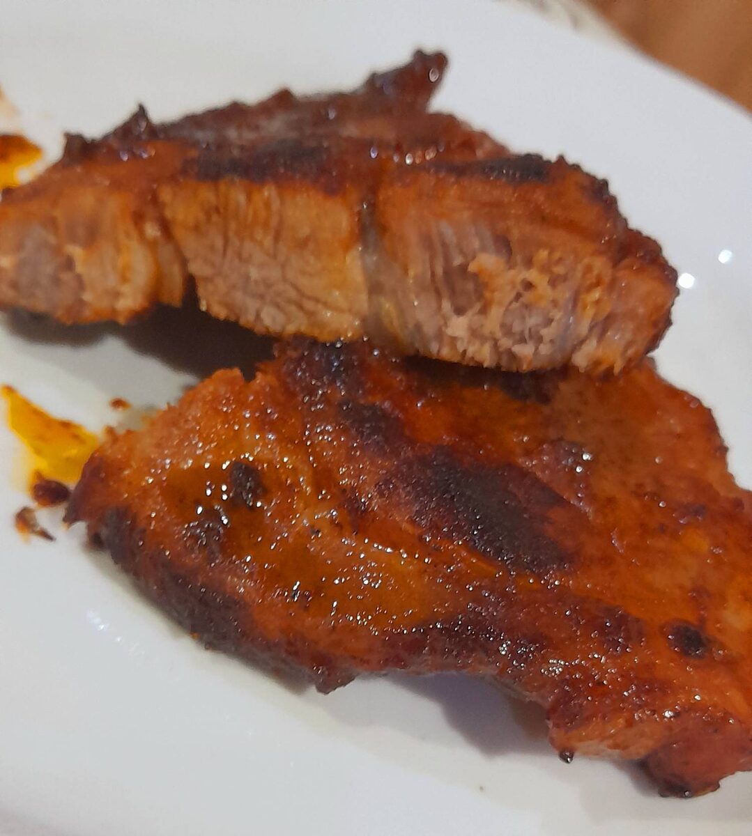 В глубокой миске смешиваем сыпучие и «тянучие» ингредиены, чеснок через пресс или мелкую терку. Перемешиваем до однородной массы. Свинину промываем, сушим бумажным полотенцем, нарезаем кусками толщиной 2 см. Хорошенько промазываем каждый кусок. Оставляем мариноваться на час. По истечении времени прогреваем сковороду, вливаем пару столовых ложек растительного масла. !!! Не используйте при жарке оливковое масло так как оно может придать нотки горечи. Аккуратно кладем на сковороду мясо. Осторожно, может брызнуть !!! На сильном огне жарим с одной стороны до золотисто-коричневой корочки, переворачиваем на другую сторону и убавляем огонь до среднего. Прожариваем. У меня ушло на первую сторону 5 минут, на вторую 7 минут. Мясо прожарки приближено к medium well. Какие степени прожарки существуют, как проверить готовность стейка? Можно ознакомиться в статье Стейк свиной шея на сковороде, Шницель из свинины, Люля на сковороде. Всем приятнейшего друзья!!! До новых встреч. С вас комментарии репосты