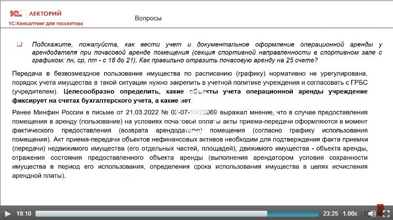 направленности в спортивном зале с графиком: пн, ср, пт - с 18 до 21). Как правильно отразить почасовую аренду на 25 счете? на этот и другие вопросы ответила Татьяна Дурнова, компания «Учет в БГУ» (г. Саранск) в лекции на тему Учет операционной аренды в 1С:БГУ. Серия 1С:Консалтинг для госсектора Также в лекции были рассмотрены: ▫️Объекты учета операционной аренды в соответствии с СГС «Аренда» ▫️Учет и документальное оформление операционной аренды у арендодателя и арендатора по СГС «Аренда» ▫️Практические примеры учета операционной аренды имущества в 1С:БГУ (ред.2) 👉Смотрите бесплатно полную видеозапись лекции 🚨Подписывайтесь на @lector_1c