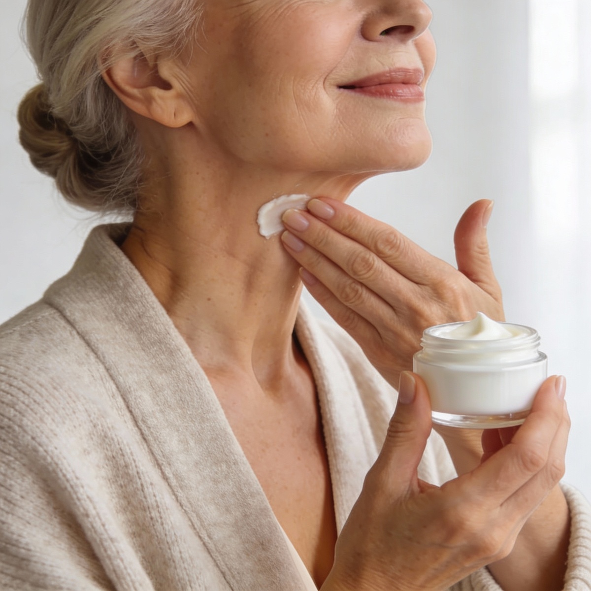- Утро: мягкое очищение, сыворотка с витамином С или антиоксидантами, увлажняющий крем, СПФ 30+ (обязательно на шею и зону V).