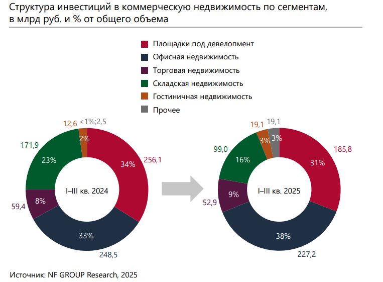 Доля инвестиций в торговую недвижимость в 2025 году составила 9% от общего объема. С начала года вложения в сегмент составили 52,9 млрд руб., что на 11% меньше, чем за аналогичный период прошлого года. Эта динамика отражает сохраняющийся консервативный подход инвесторов, обусловленный изменениями в потребительском поведении и ростом онлайн-торговли.