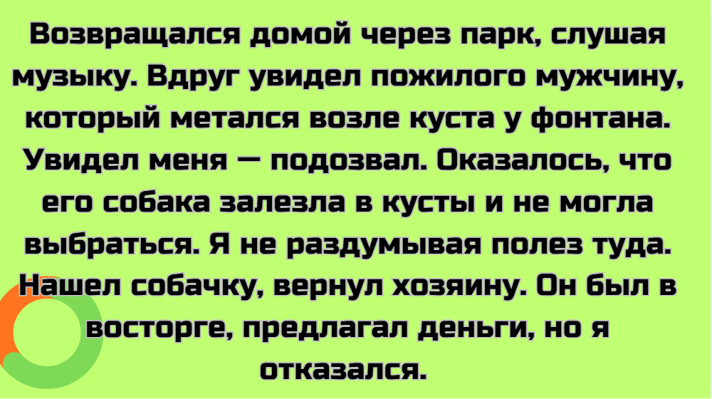 - Иду я после работы, пакеты тащу. И тут ко подходит парень с просьбой: «Мне маме подарок купить нужно, а мне не продают. Выручите?» Я думаю, ну ладно, он мне крупную купюру дал. Купила я то, что надо, выхожу. А его нет. Я в недоумении. Осматриваюсь, а на том месте, где он стоял, лежит маленькая бумажка. Беру, открываю, а там: «Девушка, лучше на эти деньги закажите себе такси. Видно, как вы устали, таская эти пакеты. Хорошего вечера». Вот это я понимаю, растет джентльмен!
