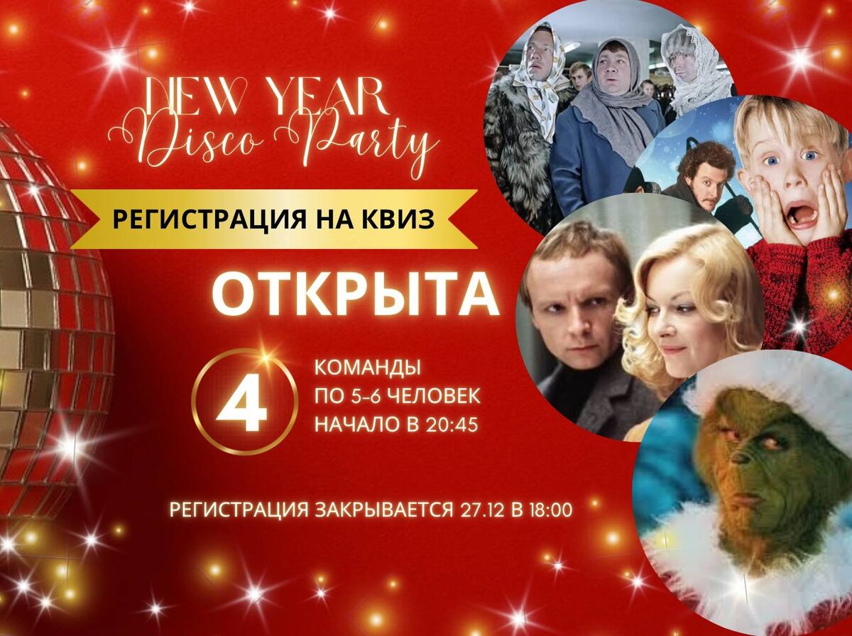 ! Любимые сюжеты, актеры и сцены, шуточки, крылатые фразы и саундтреки - идеальное начало для новогодней вечеринки! Начало квиза 27.12 в 20:45, (сбор гостей в 20:30) участвует 4 команды по 5-6 человек. Регистрация уже во всю Идет в группе > https://vk.ru/wall-97930328_4235 Объединяйтесь в команды или записывайтесь самостоятельно. ⭐ Что нужно сделать? В комментариях под указанным постом написать » "Хочу на Квиз" - если вам не принципиально в какой команде играть, главное - настроение. » "Играет Команда №1/2/3/4" и перечислить фамилии и имена участников команды. Мы объединим всех желающих, кто без команды, в 1 или 2 группы рандомным образом. Если желающих будет больше - постараемся добавить количество команд. ☝Зарегистрироваться нужно до 18:00 27 декабря под постом >> https://vk.ru/wall-97930328_4235
