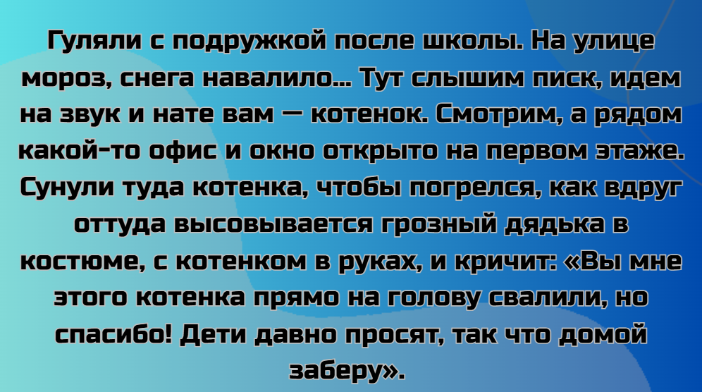 - Очень короткая история. Зашел в зоомагазин за кормом для своего кота. Там были котята, которых просто так раздавали. Конечно же рука сама потянулась их погладить. Это же котята, блин! Один из них, не раздумывая, забрался ко мне на руки, прижался и замурлыкал так громко, что его услышала кассирша на соседней кассе. Я такой: «Ох, елки зеленые!» Позже вечером он уже удобненько устроился у меня дома. © Gato1486