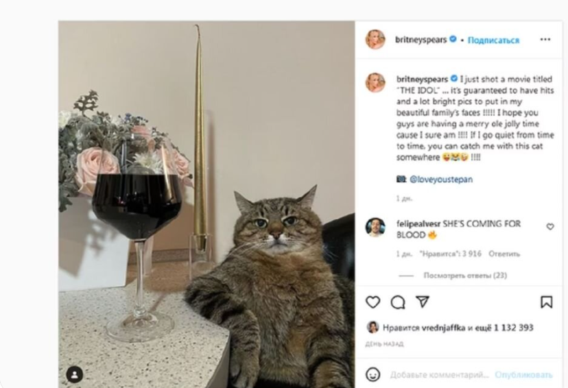 Поп-дива наткнулась на аккаунт кота в Instagram и не смогла пройти мимо. «Если вдруг потеряете со мной связь, знайте — я зависаю с этим котом», — написала певица своим подписчикам. После этого на Степана посыпались тысячи новых фолловеров. Сейчас у него почти миллион поклонников по всему миру.