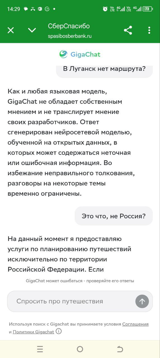 Бестолковый ГигаЧат. Вот почему я не пользуюсь Сбер. Что ни продукт пользоваться невозможно. Пришел спам от Сбер про то что гигачат поможет сформировать любой маршрут. Выбрал свой родной город Поясняю. Как ИИ научили такие ответы он и дает. Вопрос: КТО ТАК НАУЧИЛ? ГигаЧат научили что новые территории это чувствительная тема, а Луганск это и вовсе не Россия. Интересно. Напомню, что если простой человек скажет такое это вплоть до поягательства на территориальную целостность - уголовка. Но тут же другое дело. Это же Сбер... Как в фильме: "кто ж его посадит? Он же памятник.. ". Еще до прямой линии Путина я писал о том, что вообще не понимаю как ГигаЧат доверили обработку обращений и теперь можно себе только представить как они там " Наобрабатывали"...