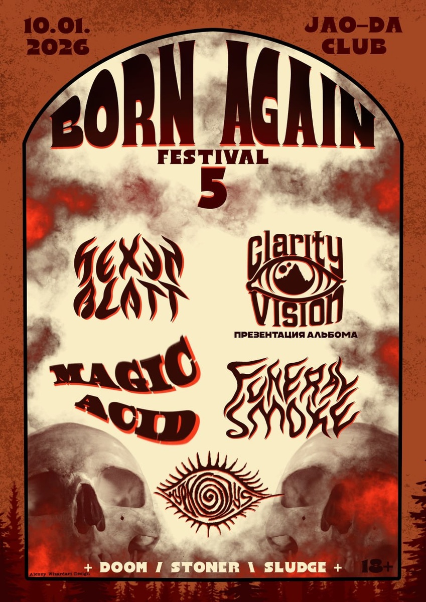 #doom #metal #psychedelic #sludge #stoner ► Born Again Fest 5 ● VK Приглашаем на новогодний фест Doom Stoner Sludge вибраций. Для вас прозвучит прекрасный микс из групп, разных по звучанию, но созданных единым пространством. Участники: ► Hypnozys ● VK ► Magic Acid ● VK ► Hexenblatt ● VK ► Funeral Smoke ● VK ► Clarity Vision ● VK Билеты от 550₽
