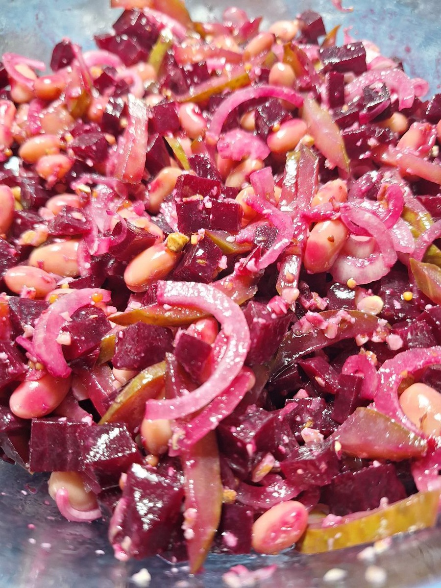Свеклу нарезать на не большие кубики, огурцы - тонкой соломкой, лук - полукольцами. Смешать раст.масло, горчицу и натертый чеснок. В миске соединить свеклу, фасоль ( без жидкости ), огурцы, лук и добавить рубленные орехи. Полить заправкой, перемешать и охладить 30 минут перед подачей. Приятного аппетита!