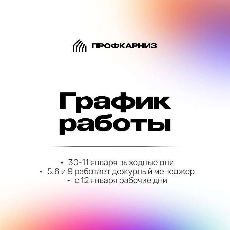 ! Информируем вас о нашем графике работы в январе. Заявки на консультацию и установку карнизов и штор можно оставлять каждый день на нашем сайте. Полноценно мы начнём работать с 12 января. При этом 5, 6 и 9 января с 10:00 до 19:00 на связи будет дежурный менеджер, чтобы оперативно помочь вам в возникающих вопросах. 8-800-100-18-66 prof-karniz.ru