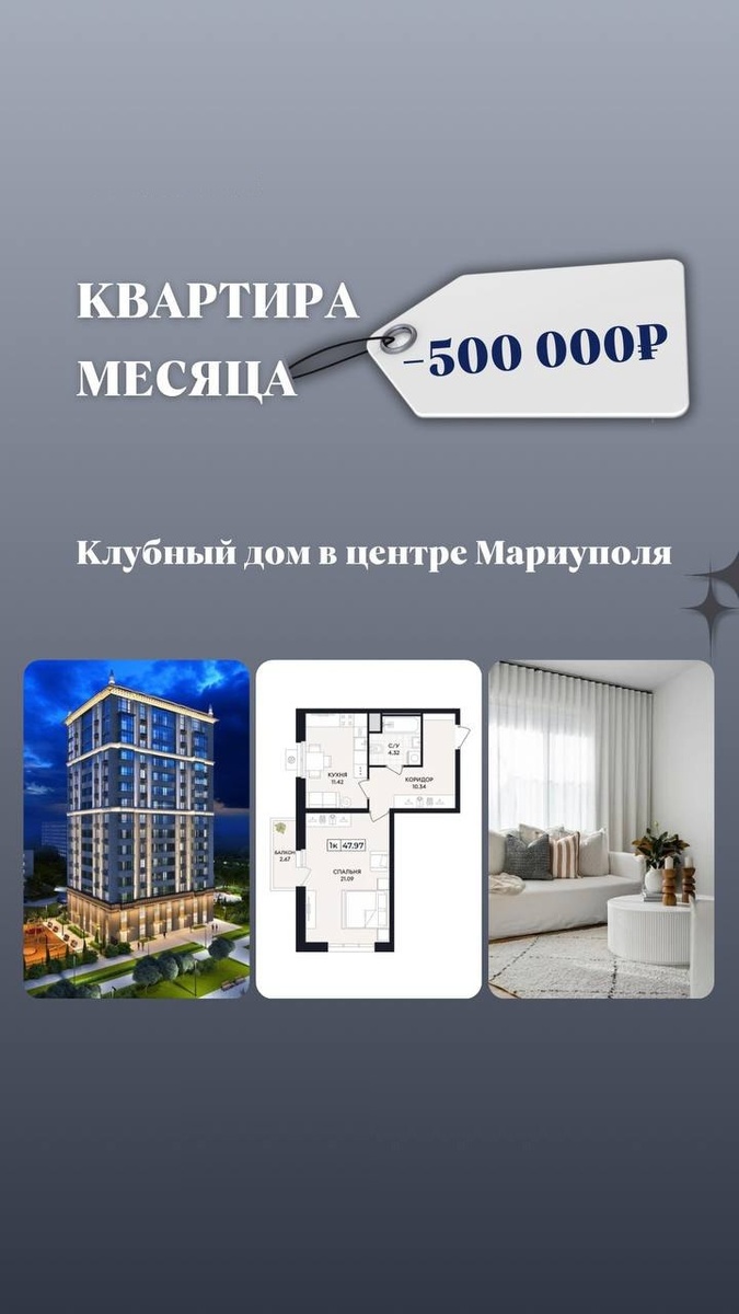 МАРИУПОЛЬ Азовское море ЖК бизнес-класса 1-комнатная квартира 47,97 м2 Этажи: с 3 по12 Формат: Для жизни или инвестиции под аренду Цена по акции ❤️Было: 9 114 300 ₽ ❤️Стало: 8 614 300 ₽ ❤️ Скидка — 500 000 ₽ Это история для тех, кто хочет: 🤍Жить у моря в современном доме 🤍Иметь объект с перспективой роста цены 🤍Получать пассивный доход Успей зафиксировать цену и выгодные условия ✉️ @albinavasilva05 #КвартираУМоря #Мариуполь #ИнвестиционныйБрокер #АльбинаВасильева