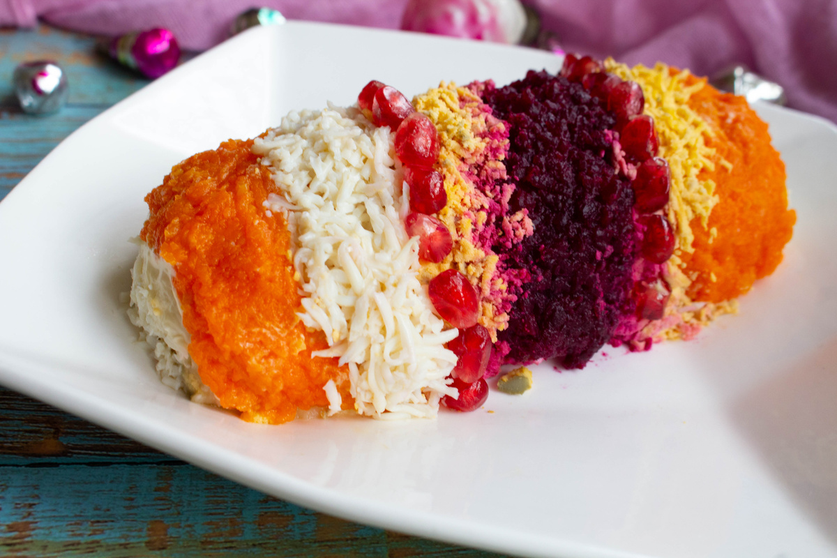 Этот салат можно сделать с совершенно разными слоями и выложить полоски сверху салата по-своему. Получается, что таким новогодним образом можно украсить любой ваш любимый слоеный салат. К новогоднему столу можно сделать подобный салат с большим количеством разнообразных слоев. Слои можно сделать из жареных грибов, сыра, консервированного зеленого горошка или кукурузы, мясных деликатесов, оливок. Овощи в слоях можно использовать только свои любимые. Салат порадует вас своим ярким видом и поднимет праздничное настроение. Картофель - 2 шт. Морковь - 2 шт. Свекла - 1 шт. Куриное филе - 150 г. Яйцо куриное - 3 шт. Майонез - 3-4 ст.л. Соль - по вкусу Зерна граната - для украшения Овощи, яйца и куриное филе варим до готовности. Овощи и вареные яйца остудим и почистим. На рабочую поверхность выложим пищевую пленку и первый слой делаем картофельный. Формируем прямоугольный слой. Картофель натрем через мелкую терку. Смажем слой майонезом и посолим по вкусу. Куриное филе нарежем и выложим следующ