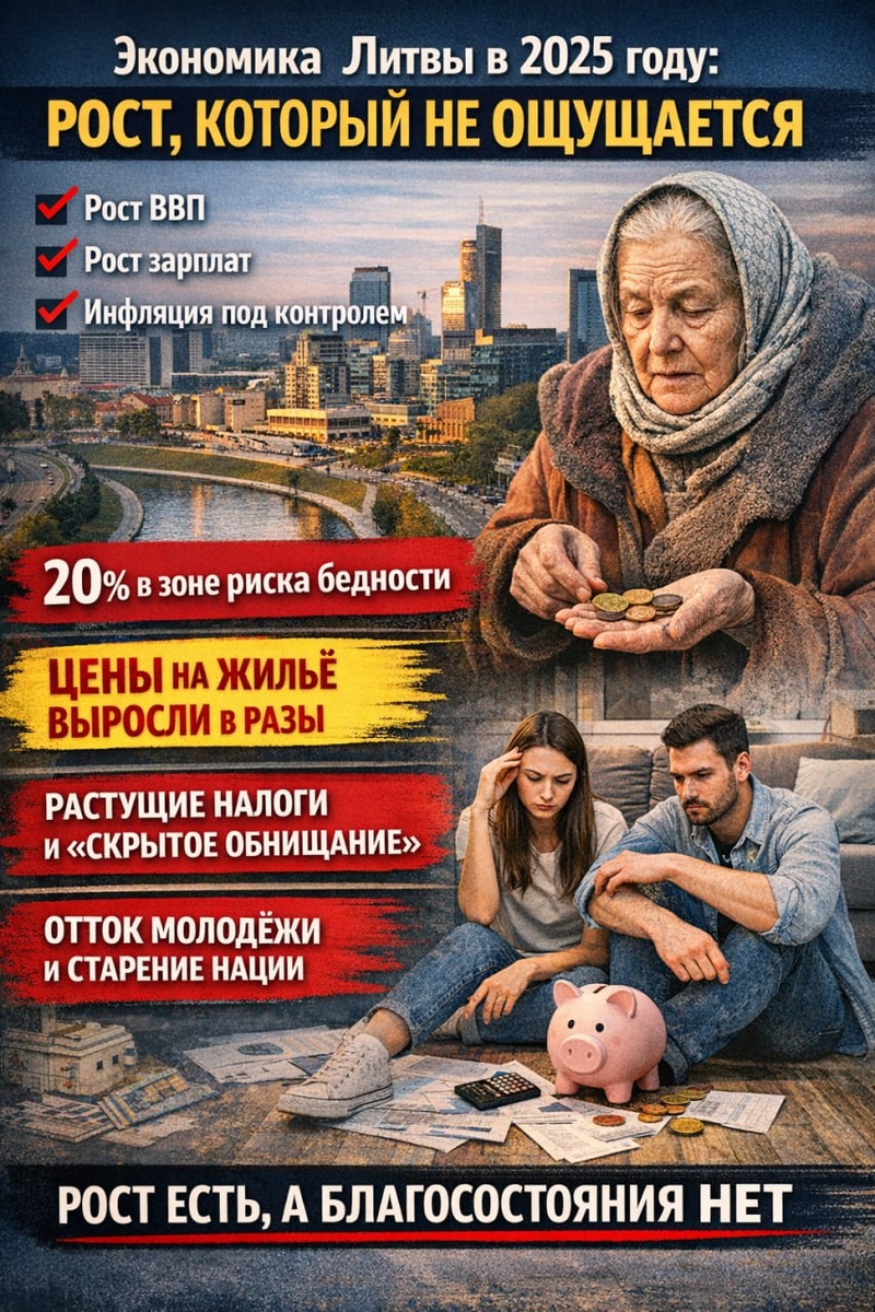 В 2025 году литовская экономика демонстрирует формально позитивные макропоказатели: умеренный рост ВВП, контролируемую инфляцию и продолжающееся увеличение заработных плат. Однако за этой статистической картиной скрывается углубляющийся социальный разрыв, который всё чаще ставит под сомнение саму эффективность выбранной экономической модели. Ключевая проблема — отсутствие конвертации макроэкономического роста в реальное улучшение качества жизни для значительной части населения. Экономический рост оказывается сосредоточенным в узких сегментах — крупных городах, высокооплачиваемых отраслях и экспортно-ориентированном бизнесе, тогда как периферия и социально уязвимые группы остаются в состоянии хронического отставания. Одним из главных социальных индикаторов неблагополучия остаётся высокий уровень риска бедности, который в Литве превышает 20% населения. Особенно показательно, что наиболее уязвимой группой являются пенсионеры: более трети людей старше 65 лет живут на грани или за гранью