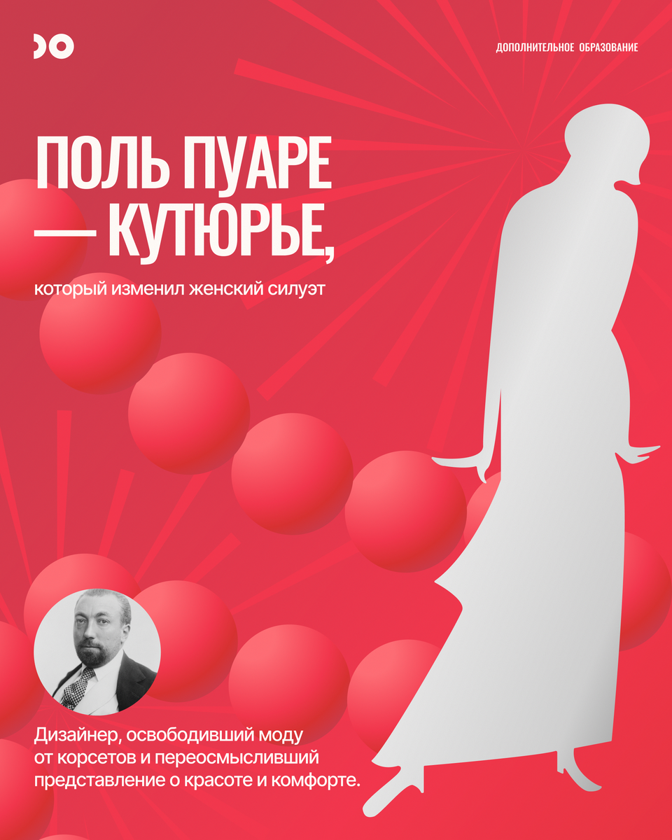 Поль Пуаре вошёл в историю моды как кутюрье, который переосмыслил саму конструкцию женской одежды. Он отказался от корсетов и предложил свободные силуэты, построенные на линии плеч, мягко струящиеся по фигуре.