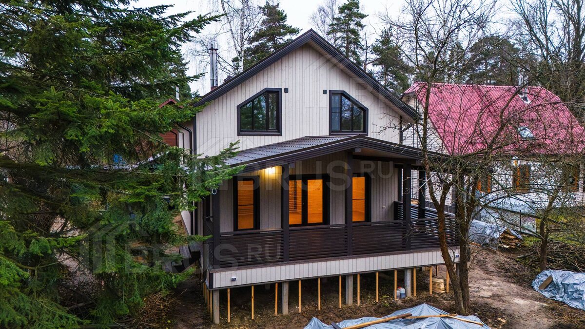 Комплектация: "Постоянное проживание + Электрика" Общая площадь дома — 156,4 м² Тёплая площадь — 117,7 м² Площадь открытой террасы и крыльца — 38,7 м² Внешняя отделка выполнена скандинавской доской с поднятым ворсом в светлых тонах. В доме располагаются: на 1 этаже — кухня-гостиная, спальня, тех. помещение, санузел, холл. На 2 этаже — 3 спальни, санузел и холл. Адрес строительства: Московская область, городской округ Щёлково, пгт. Загорянский. Ссылка на фотоотчёт: https://brus.ru/otchety/karkasnyj-dom-8h9
