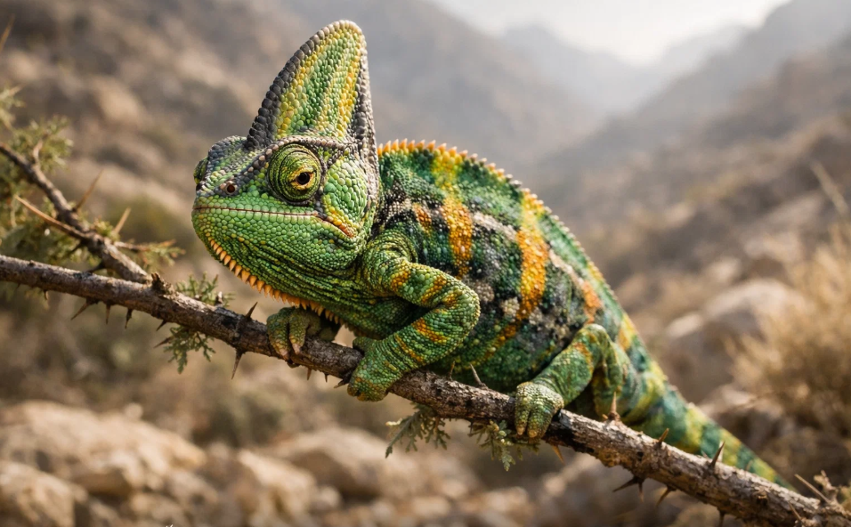 В мире рептилий, населяющих засушливые и горные ландшафты Аравийского полуострова, существует вид, который давно приковал внимание как ученых, так и любителей террариумистики. Йеменский хамелеон, известный также как хамелеон-шлемоносец, — это не просто ящерица, меняющая цвет. Это сложное, высокоорганизованное существо с ярко выраженной индивидуальностью, демонстрирующее удивительные адаптации для выживания в суровых условиях. Его жизнь — это история мастерской маскировки, невероятных охотничьих стратегий и противоречивого характера, сочетающего отстраненную величественность с внезапными вспышками темперамента.
